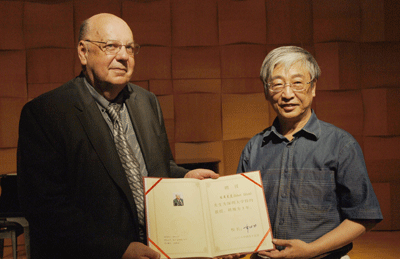 在师范学院B座101 音乐厅,章必功向罗伯特?埃库兰度先生颁发了深圳大学特约教授聘书。李永华向在座师生介绍罗伯特?埃库兰度先生及夫人。