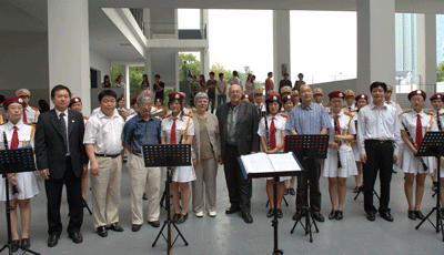 深圳大学军乐团向罗伯特?埃库兰度先生及夫人献上激情洋溢的演奏,曲目有《欢乐颂》、《茉莉花》和《拉德斯基进行曲》。罗伯特?埃库兰度先生即兴发挥,亲自上阵为深大军乐团指挥,博得了在场师生的阵阵喝彩。