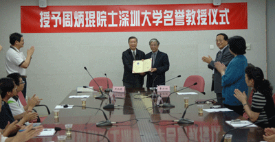 周炳琨院士说,他非常看重深圳大学这个名誉教授的头衔,虽然自己已不在教学第一线,但会尽自己所能让这个名誉教授名符其实。他表示在以后会做到关心深大、宣传深大、学习深大。他表示:第一、办好一个学校,师资建设非常重要,他会为深大推荐一些好的人才。第二,深大是改革开放三十年里高校的排头兵,深大的办学理念全面体现了改革开放、解放思想,深大用其文化影响了深圳。他会尽力宣传深大的各个方面。第三,学习深大的办学理念与文化特色,他相信,到2020年深大一定能够实现建成知名的、有特色的教学科研型大学的目标,他会为这个目标的实现尽自己的一份力。