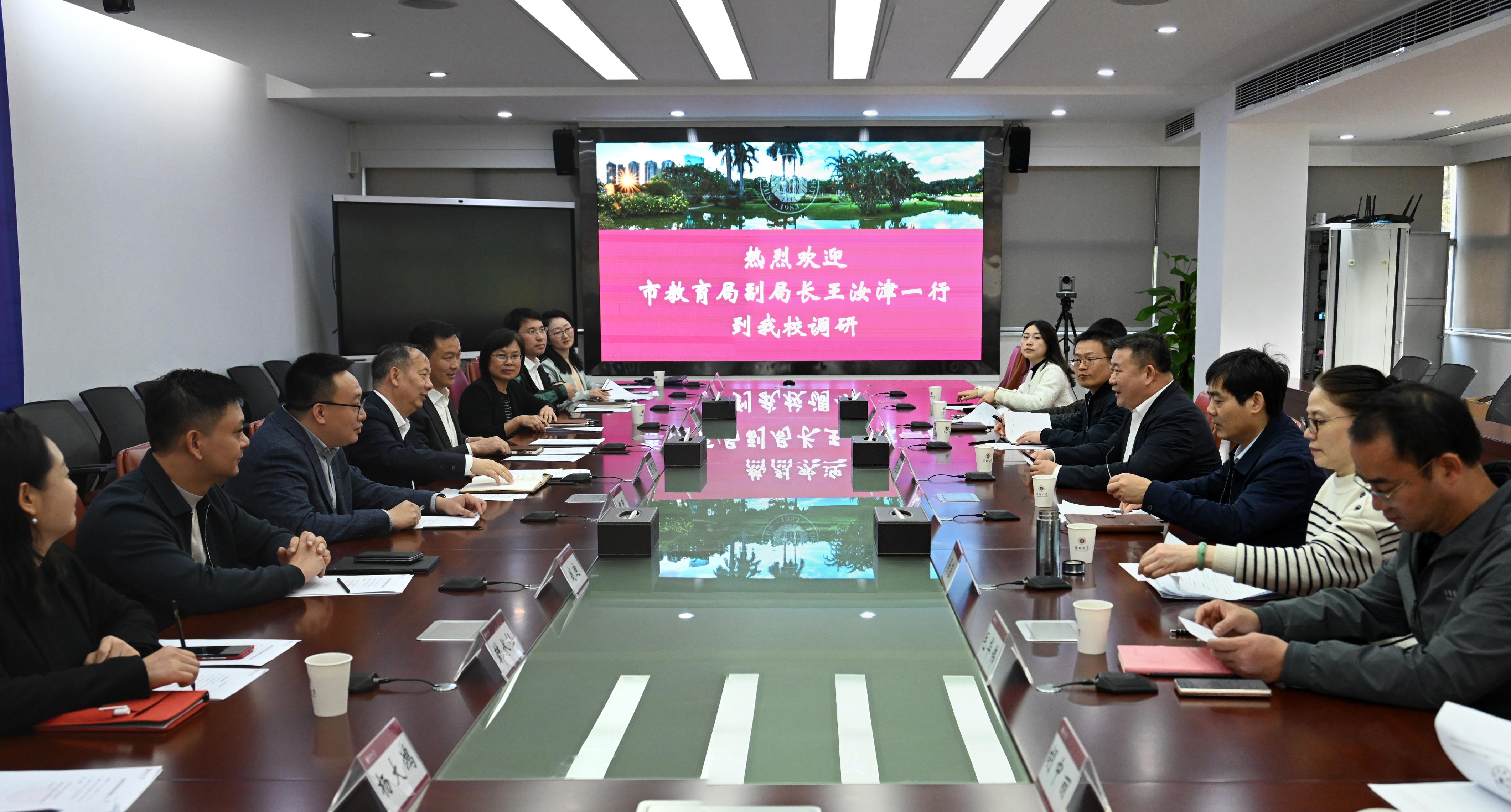 3月8日下午,深圳市教育局党组成员、副局长王汝津一行到深圳大学调研。深圳大学校长毛军发、党委副书记吴报水在汇元楼201室会见来宾,双方展开座谈交流。