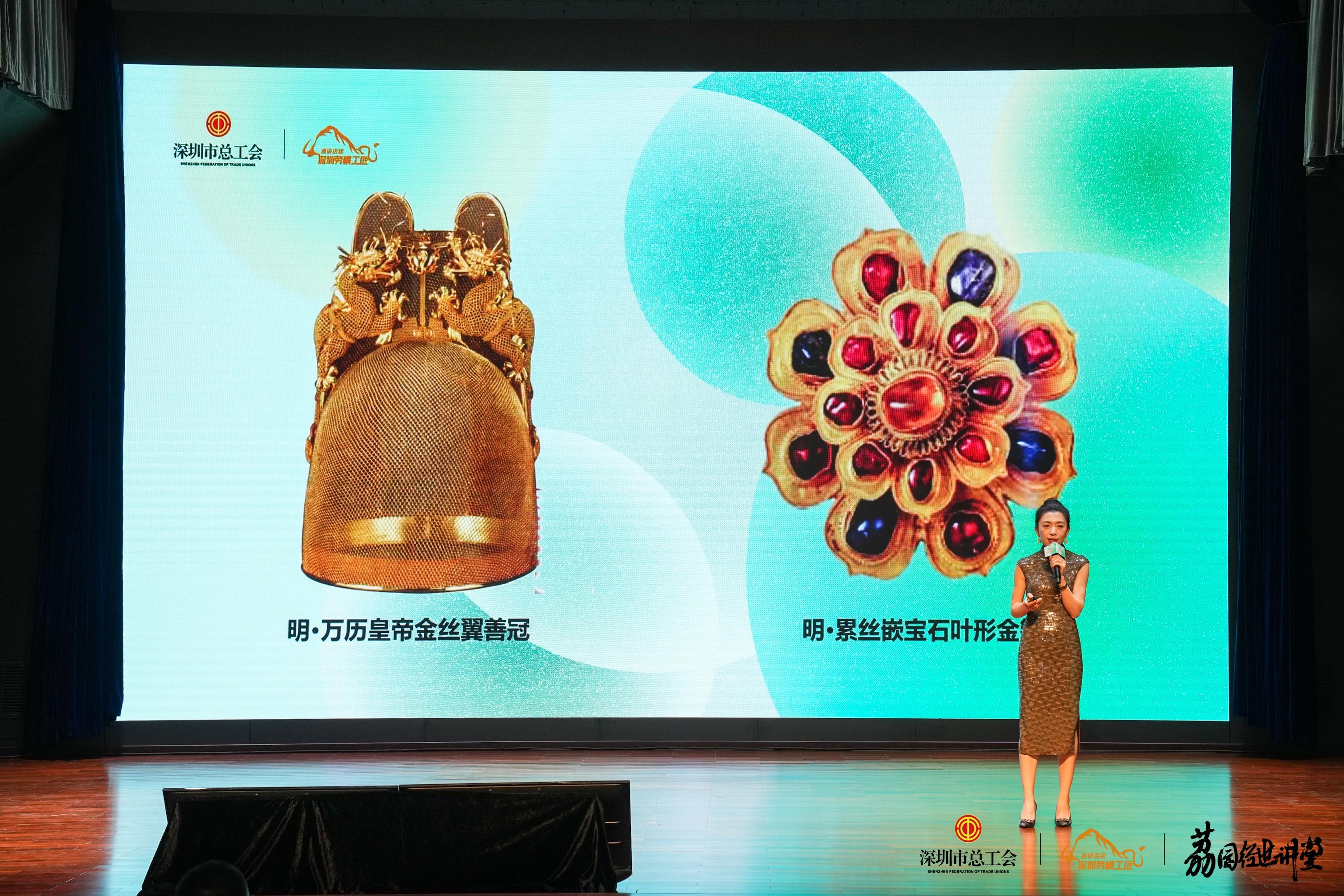 屏幕上展示的花丝镶嵌黄金饰品,让现场师生们不禁赞叹其工艺之精美。非遗花丝镶嵌与錾刻技艺代表性传承人、广东省五一劳动奖获得者、深圳市萃华珠宝首饰有限公司首席设计师郭夷锬以“非遗古艺‘焕’新生”为题,分享自己的成长历程与专业感想。为了让传统文化与现代艺术融合,让民族之魂迈向世界舞台,她与团队用两个月时间完成284件花丝镶嵌作品,惊艳巴黎时装周,让世界看见中国非遗技艺的价值。“一路下来,支撑我的不仅仅是喜爱,更重要的是信念。” 郭夷锬鼓励学子们在前进路上坚定信念、不忘初心,坚持创新精神,化质疑与反对为前行动力,践行工匠精神,为传统的手工技艺谱写时代的新篇章。