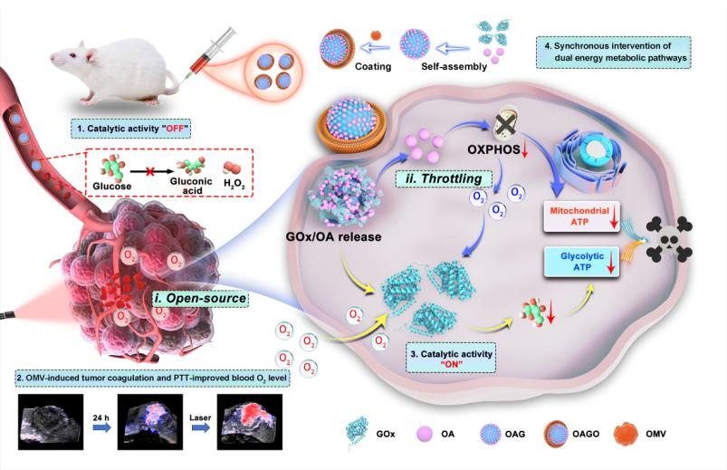 肿瘤细胞通过代谢重编程依赖糖酵解和氧化磷酸化(OXPHOS)双重途径获取能量,单一代谢抑制易引发代偿效应,限制治疗效果。现有的双重代谢抑制药物存在靶向性差、毒副作用大等问题,且肿瘤微环境(TME)的缺氧特性进一步削弱了氧依赖性酶催化疗法的效果。本研究提出“开源节流”的氧气(O2)调控策略,构建了一种同步干预双能量代谢途径的抗肿瘤纳米平台(OAGO)。该平台由葡萄糖氧化酶(GOx)和寡霉素A(OA)自组装而成,并包被细菌外膜囊泡(OMVs)。OAGO在酸性TME中解离,释放OA和GOx,恢复酶活性。通过GOx介导的糖酵解阻断和OA诱导的OXPHOS抑制,实现双能量代谢途径的同步干预。GOx催化生成的过氧化氢导致肿瘤氧化应激,并加剧线粒体功能损伤。同时,抑制OXPHOS可减少O2消耗,从而改善TME中的缺氧(即“节流”策略)。OMV不仅增强OAGO在肿瘤内的蓄积,还通过破坏肿瘤血管和诱导红细胞外渗来提高肿瘤的血氧饱和度(即“开源”策略)。此外,OMV诱导的肿瘤凝血用于体内光热疗法,进一步提升肿瘤血氧水平和局部温度,为GOx催化提供了有利条件。在三阴性乳腺癌小鼠肿瘤模型上,OAGO表现出优异的抗肿瘤疗效,揭示了O2调节与能量代谢途径的同步干预在GOx疗法中的重要性,为新型抗肿瘤治疗策略的开发提供了新思路。