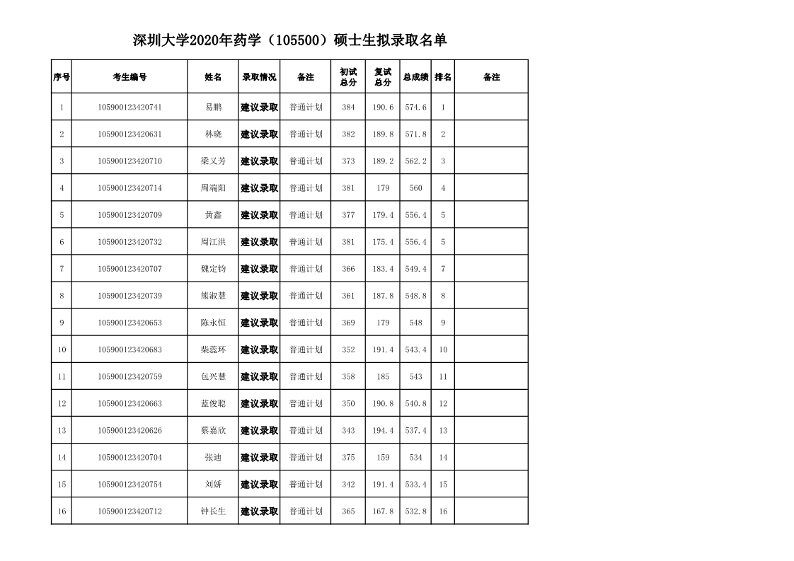 深圳大学2020年药学(105500)硕士生拟录取名单