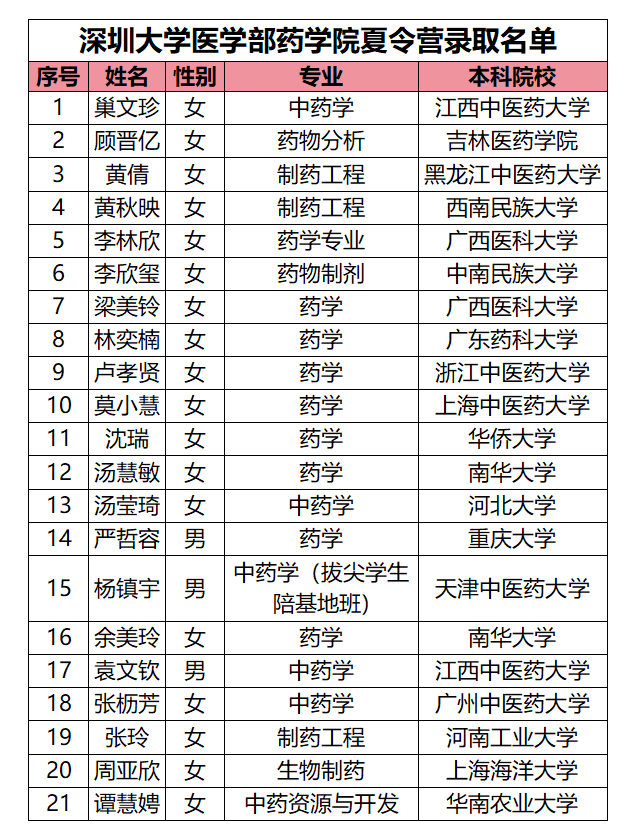 深圳大学医学部药学院2024年“夏令营”录取名单公示 来源: 发布时间:2024-07-11 12:57:36 浏览次数: 次 【字体:小 大】 录取名单见下表:请各位被录取的同学按时报到,深圳大学医学部药学院欢迎您! 点赞 收藏 分享到: 【打印正文】