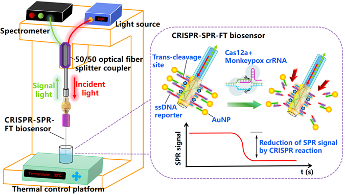 深圳大学物理与光电工程学院李学金教授团队和张晗教授团队联合开发出全球首款用于猴痘病毒的无扩增检测和基因分型的光纤生物探针检测设备以及猴痘检测的一次性光纤探针芯片