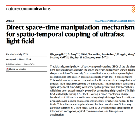 物理与光电工程学院徐世祥教授研究团队联合微纳光电子学研究院袁小聪教授团队在《Nature Communications》发表超快时空光场调控研究成果