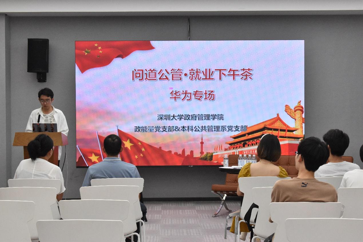 2024年6月20日下午,政府管理学院政能量党支部、本科公共管理系党支部与公共管理协会于守正楼A213联合举办了问道公管·就业下午茶(华为专场)活动,活动旨在搭建应届毕业生与其他在校年级学生的就业交流平台,促进各阶段党支部成员更好地进行就业规划,交流就业经验,充分发挥应届优秀毕业生的朋辈引领作用。政府管理学院党委副书记张国强,政府管理学院政能量党支部书记耿旭副教授,本科公共管理系党支部组织委员杨毓娜,2020级行政管理专业3位已被华为技术有限公司录用的毕业生张航、魏正男、林洁憧及数十位本科生积极分子、发展对象共同参与本次活动。活动由本科公共管理系党支部预备党员金圣淋主持。